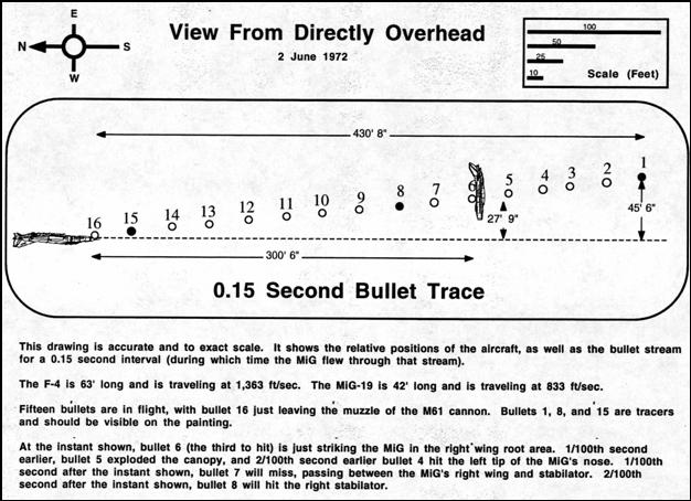 The F-4 is 63' long and is traveling at 1,363 feet per second. The MiG-19 is 42' long and traveling at 833 feet per second. Fifteen bullets are in flight, with bullet #16 just leaving the muzzle of the M61 cannon which is firing 100 bullets per second. Bullets #1, #8, and #15 are tracer rounds and should be visible on the painting. At the instant shown, bullet #6 (the 3rd to hit) is just striking the